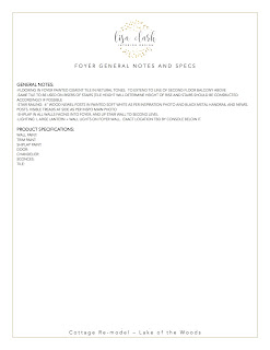 As with the kitchen, the foyer design diary has two parts. First is a collection of 3D renderings detailing lighting, tiles, and even accessories. Second is a spec sheet that tracks the specific details on each required element.